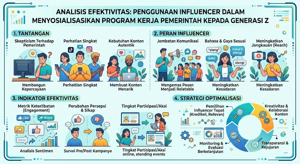 Efektivitas penggunaan influencer terletak pada kemampuan mereka dalam menerjemahkan bahasa birokrasi yang kompleks menjadi narasi yang ringan dan emosional. Generasi Z cenderung lebih memercayai sosok yang mereka ikuti di media sosial dibandingkan dengan pernyataan resmi di kanal berita tradisional. Dengan memanfaatkan figur yang memiliki kedekatan personal dengan audiensnya, pesan-pesan kebijakan publik seperti program kesehatan, pendidikan, hingga transformasi digital dapat masuk ke ruang privat Gen Z tanpa terkesan menggurui.