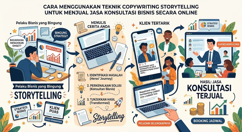 Menjual jasa konsultasi bisnis secara online sering kali menghadapi tantangan besar berupa tingkat kepercayaan calon klien yang rendah. Berbeda dengan produk fisik yang bisa dilihat dan dirasakan, jasa konsultasi adalah sesuatu yang abstrak. Di sinilah teknik copywriting storytelling berperan penting untuk menjembatani jarak tersebut. Storytelling bukan sekadar bercerita, melainkan sebuah strategi untuk membangun koneksi emosional dan membuktikan keahlian Anda tanpa terkesan sedang menggurui atau memaksa.