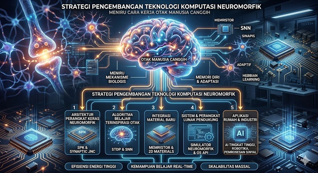 Era transformasi digital saat ini menuntut efisiensi pemrosesan data yang jauh melampaui kemampuan arsitektur komputer tradisional. Komputasi neuromorfik muncul sebagai solusi revolusioner yang dirancang untuk meniru struktur biologis dan mekanisme kerja saraf otak manusia. Berbeda dengan arsitektur Von Neumann yang memisahkan unit pemrosesan dan memori, teknologi neuromorfik mengintegrasikan keduanya guna meminimalkan konsumsi energi serta mempercepat transmisi informasi. Strategi pengembangan teknologi ini berfokus pada penciptaan sistem yang mampu belajar secara mandiri dan beradaptasi dengan pola data yang kompleks secara real-time.